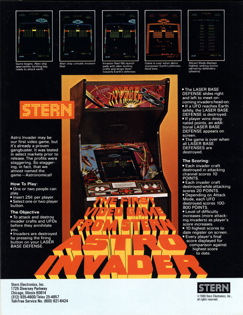 Using buttons to move left, right and fire, you attempt to ward off invading aliens and their flying saucers. The aliens are dropped off from a saucer and stored in multiple columns until a column is full, then the aliens in that column descend, one by one, and attack. Also, the saucers sometimes descend to attack; if they are not destroyed, one ship is lost.