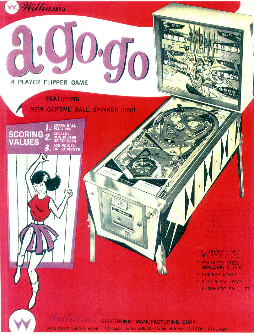 Williams A-Go-Go, released in May of 1966, was a huge success and the second machine to feature the contemporary artwork by designer/artist Jerry Kelley. Kelley not only did the artwork, he also designed the low-charger cabinet and invented the smooth nylon buttons. Some years before, he designed the famous Williams logo featuring the sharp-edged “W”. A-Go-Go had several production runs and the last one already had the new-style cabinet with the new triple-chute front door, also designed by Jerry Kelley. This last version of A-Go-Go would have later been called a Limited Edition. The dancing Man with the stylish beard is a self-portrait of Kelley. With a production-run of 5,100 it ranks #4 of the most succesful machines of the 1960’s right behind Gaucho, Capersville and Ship-Mates. The major part of them went to Germany.