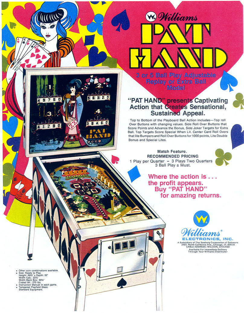 Pat Hand is a pinball machine from May 1975, manufactured by Williams Electronic Games, Inc.