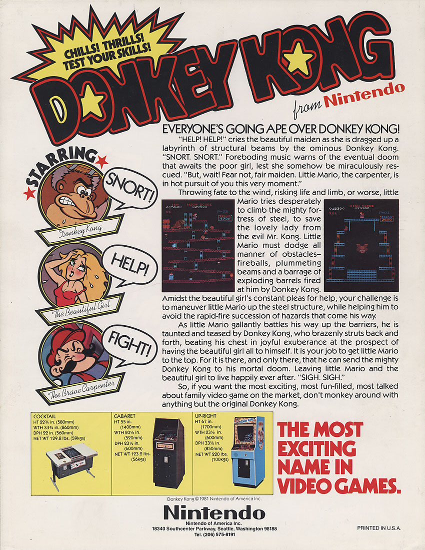 Jumpman – known today as Mario – must traverse levels structures to save his girlfriend, Pauline, from Donkey Kong before time runs out. The levels include Girders, Rivets, Elevators, and Conveyor Belts. Mario must avoid flames, barrels, and bouncing rivets to reach his goal.