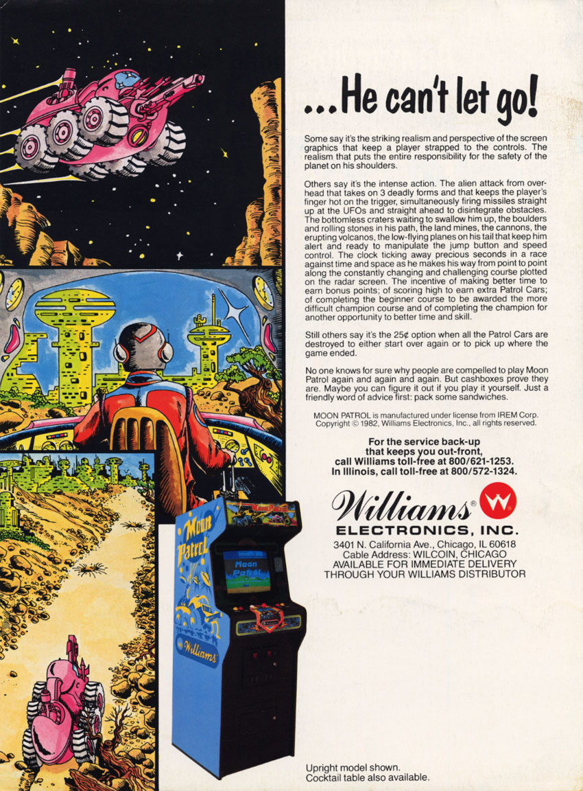Player drives a moon buggy jumping over craters, rocks and land mines, shooting simultaneously at rocks in front and aliens above while dodging their missiles. Features very catchy background music and cute bouncing tires when the buggy is destroyed. Foreground and background terrain scroll at different rates giving the illusion of depth.
