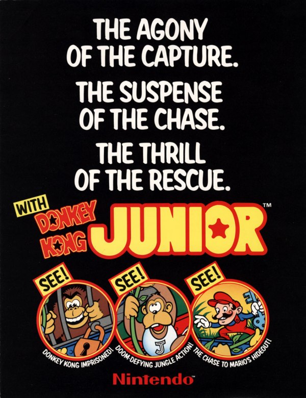The player controls a small monkey who must leap from platforms, climb vines, and avoid enemies to rescue Donkey Kong from Mario. The game has several distinct levels with similar goals. Fruit can be dropped on enemies leg traps and birds to kill them.