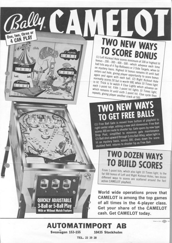 Camelot by Bally was designed in October 1969 and manufactured in February 1970. It was the second Bally four-player featuring the new 3 Inch ‘king size’ flippers. Also, it was one of just two Bally four-players combining 4-digit scoring with the new large flippers. The two-player version with identical playfield and cabinet artwork (in different colors however) is Galahad, manufactured in January 1970. Like all Bally machines with the lift-up frame cabinet, it needs slightly shorter 71 cm, black painted legs.