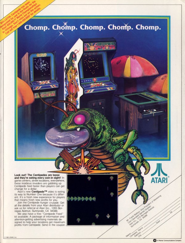 The player controls a gun that can only move in the bottom fifth of the screen. The object is to shoot a centipede that works its way down to the player area through a field of mushrooms. Other attacking enemies are fleas, spiders, and scorpions.