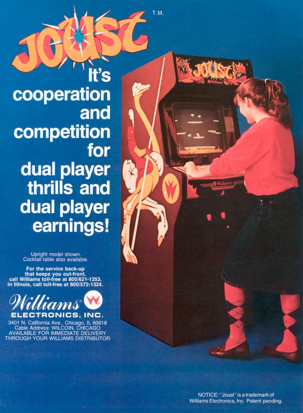 You are a knight flying on an ostrich, battling buzzard-mounted enemies. To fly, you repeatedly hit the flap button. To topple the Buzzard-Riders “the highest lance wins.” Two-player head-to-head play is excellent.