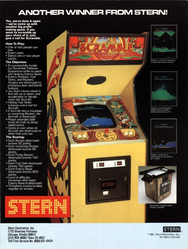 Player controls a spaceship that must infiltrate the enemy Scramble system in this side-view shooter/bomber classic. Player must destroy the Base at the end of the system. In the STERN version, the enemy base is much harder to destroy than the Konami version but at least in the STERN version, if you lose a base while destroying the enemy base, you do not lose the life and the game starts you back at the system beginning.
